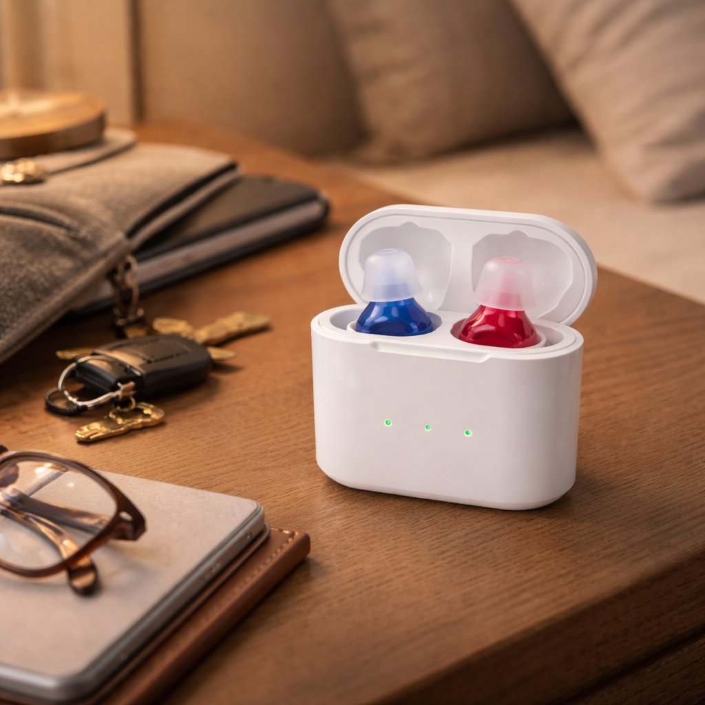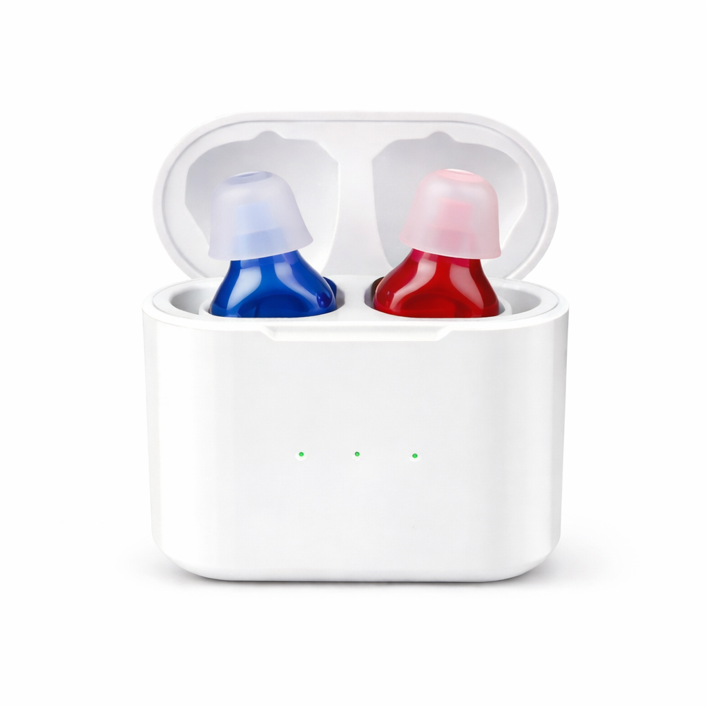 - In-Ear Invisi-Aids (×2): One red and one blue unit for left and right ears.